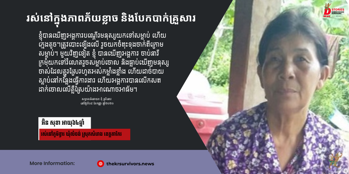 នៅពេលយប់ឡើង សុខា និងប្រជាជនដទៃទៀតមិនហ៊ានសូម្បីតែនិយាយគ្នា ព្រោះខ្លាចកងឈ្លបដែលលួចពួនស្ដាប់នៅក្រោមផ្ទះ យកទៅរាយការណ៍មិនល្អជូនអង្គការ និងបញ្ជូនខ្លួនយកទៅសម្លាប់ចោល។ ជាក់ស្ដែង សុខា បានឃើញអង្គការបណ្ដើរមនុស្សយកទៅសម្លាប់ ហើយក្មេងតូចៗត្រូវបោះឡើងលើ រួចយកចំពុះទុងចាក់ពីក្រោមសម្លាប់។ មួយវិញទៀត សុខា បានឃើញអង្គការ ចាប់នារីក្រមុំយកទៅរំលោភរួចសម្លាប់ចោល ហើយគាត់ក៏ធ្លាប់ឃើញមនុស្សចាស់ដែលភ្ជួរស្រែរហូតអស់កម្លាំងខ្លាំង និងដាច់បាយស្លាប់នៅកន្លែងធ្វើការងារ ត្រូវបានអង្គការលើកសពចាក់ចោលលើភ្លឺស្រែយ៉ាងអាណោចអាធ័ម។